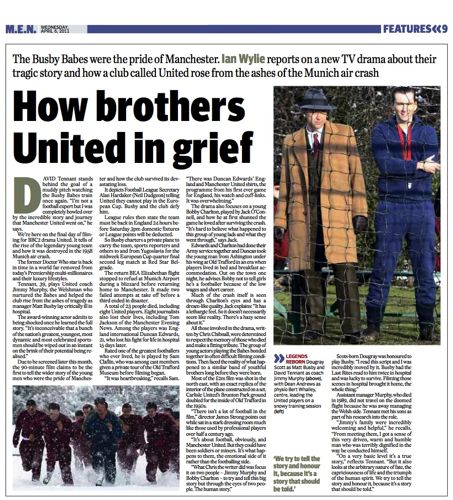 “Jimmy Murphy is one of our main characters, who wasn’t on the plane because he was managing the Welsh team. And because Matt Busby was in hospital following the crash, it was left to him really to re-build the side. We talked to his two sons in Manchester and it was great to get an essence of what their father was like. David Tennant was there for that and I know he found it very useful. Harry Gregg is in touch with us, one of the other survivors. We went up to Old Trafford and we walked around the stadium and we talked to people there. And everybody who was either a survivor or connected with it, we’ve let them know that we’re making the film. Their feedback has been very helpful as well in the script.”